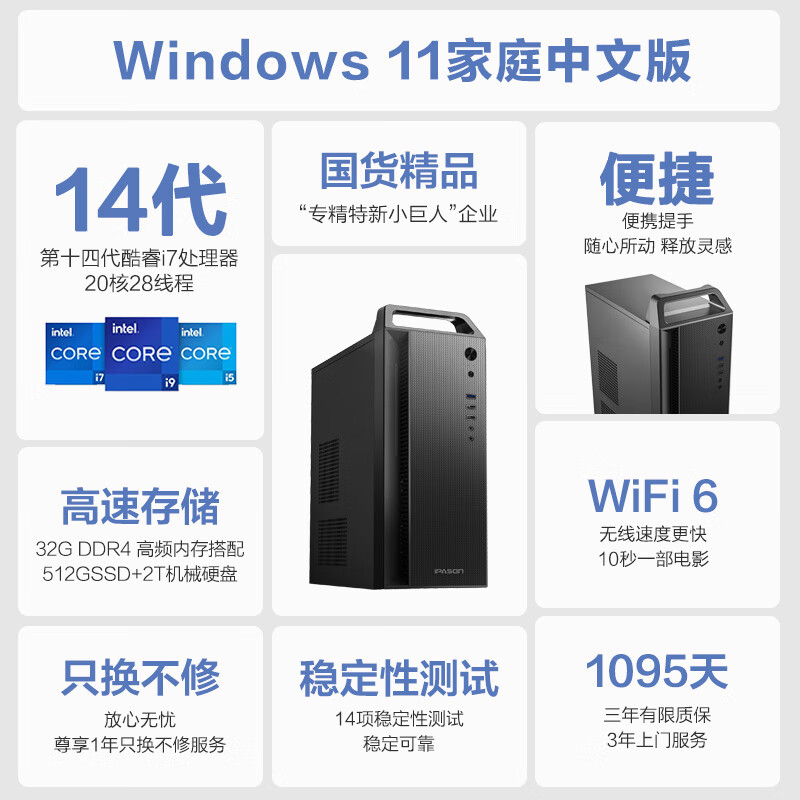攀升商睿2PRO 设计师办公商用台式电脑台式机组装电脑主机全套(14代酷睿i7 32G 512G+2T 4G独显)价格:5499.00元!