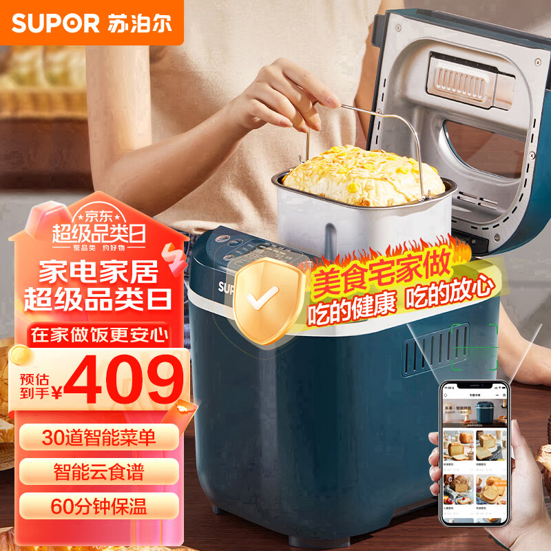 苏泊尔 SUPOR 面包机 全自动大容量面包机家用 和面机揉面机可预约多功能面包机 智能投撒果料MT20A801价格:409.00元!