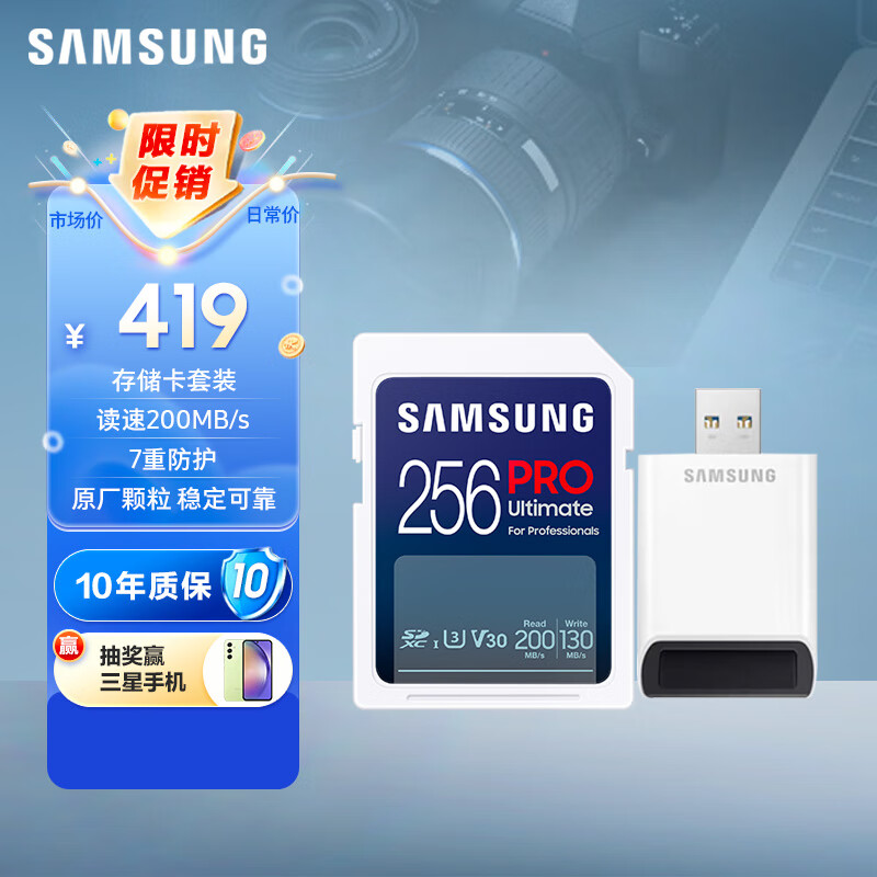 三星(SAMSUNG)256GB SD存储卡读卡器套装Ultimate 4K超高清拍摄 相机内存卡sd大卡 读速200MB/s写速130MB/s价格:419.00元!