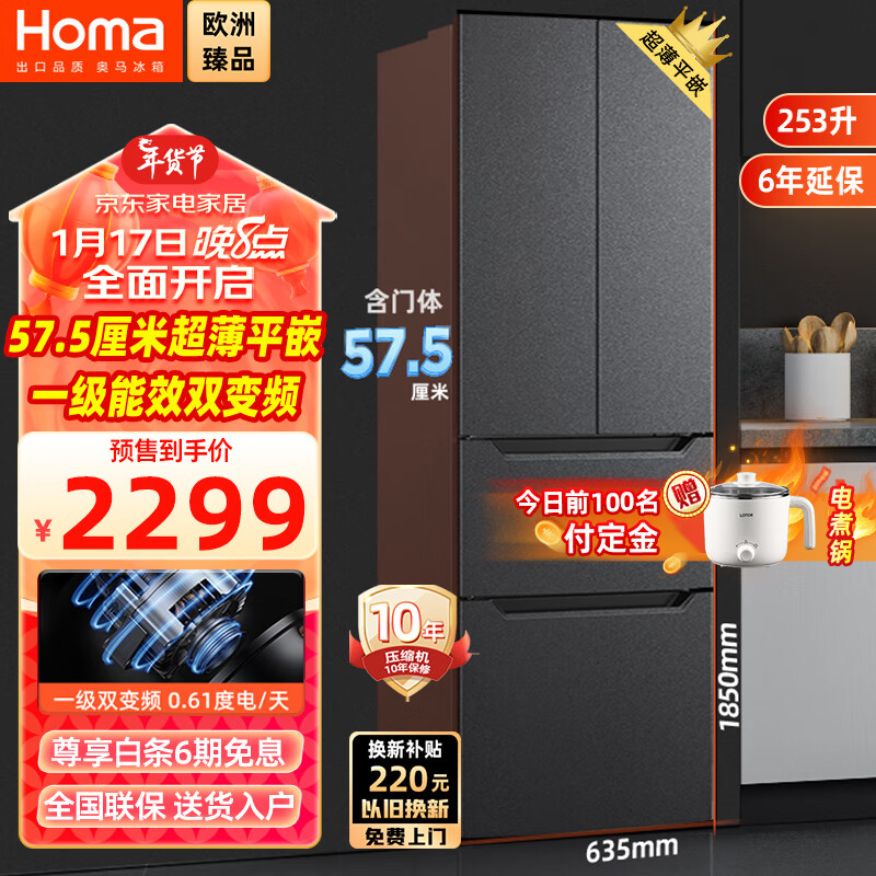 奥马(Homa)欧洲臻品60cm以下超薄253升一级能效变频风冷无霜双开门四开门三开门法式家用电冰箱BCD-253WF/B价格:2299.00元!