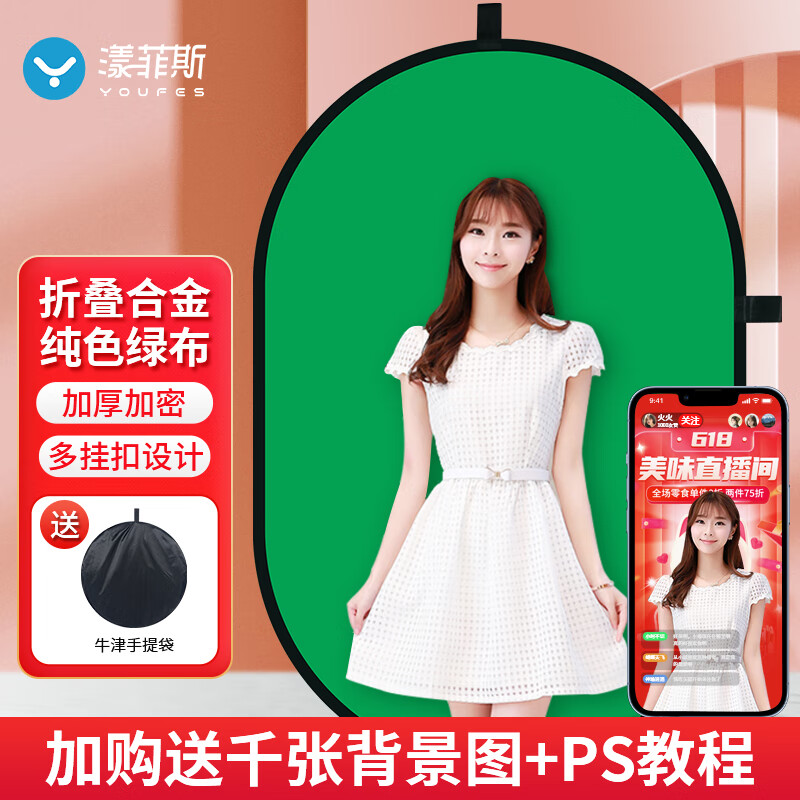 漾菲斯YC5专业直播绿幕抠像布折叠便携式免支架 加厚纯色绿布背景布板补光灯拍照摄影布视频幕布 1.5*2米价格:119.00元!