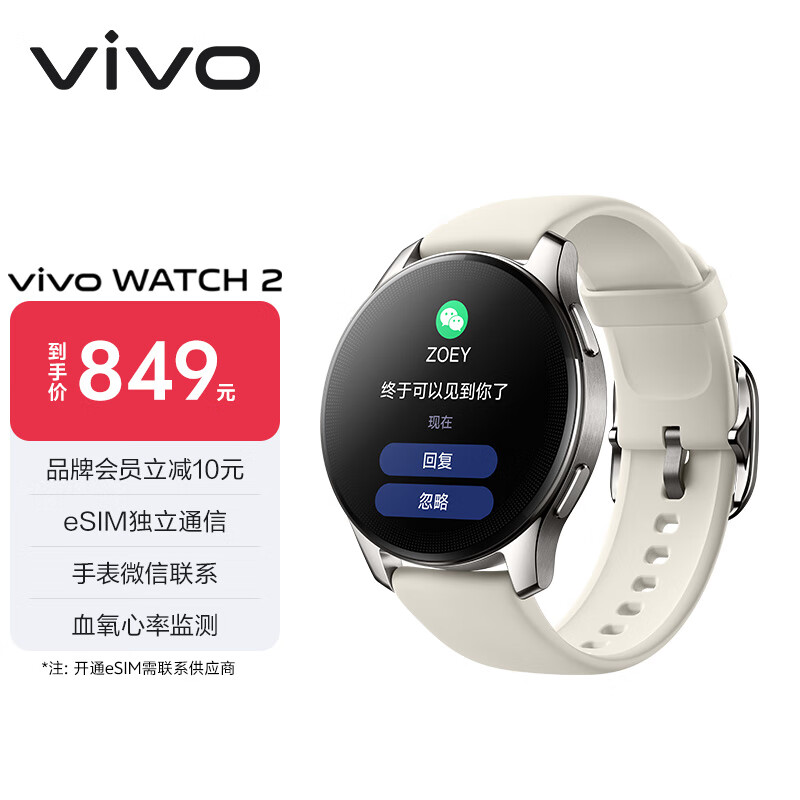 vivo WATCH 2 破晓白 智能手表 血氧监测 智能运动 SOS紧急联络 eSIM独立通信 强劲续航价格:849.00元!