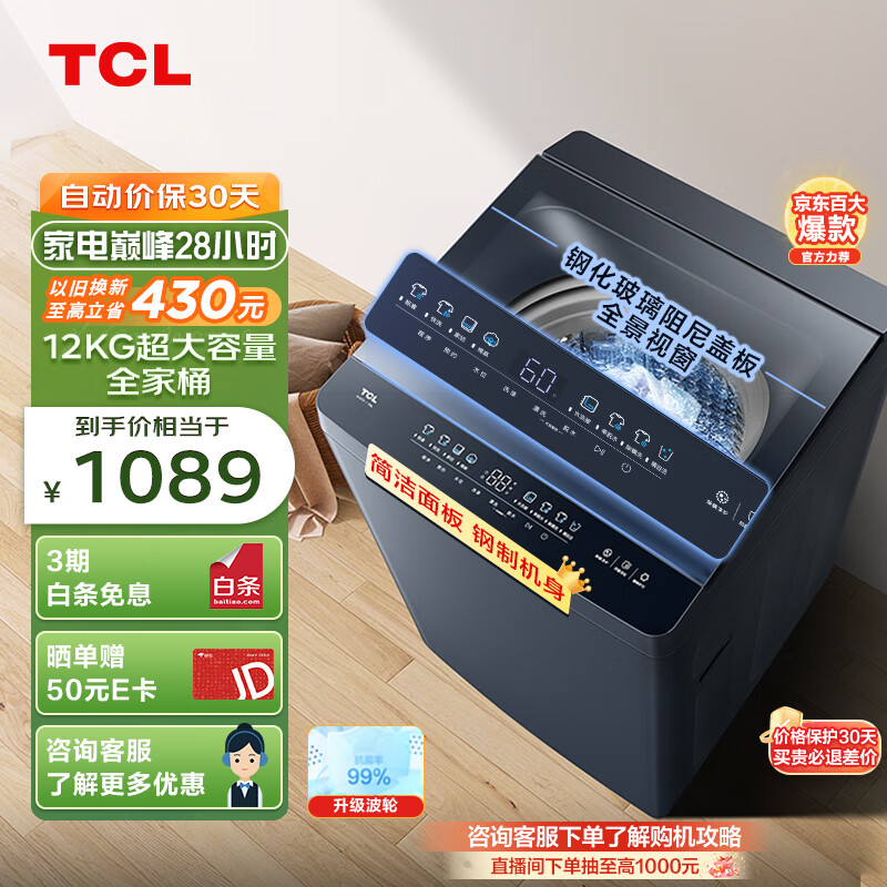 TCL 12KG超大容量全家桶T5 深层除螨 全景视窗 洗衣机全自动家用 以旧换新 宿舍租房神器 B120T5价格:1089.00元!