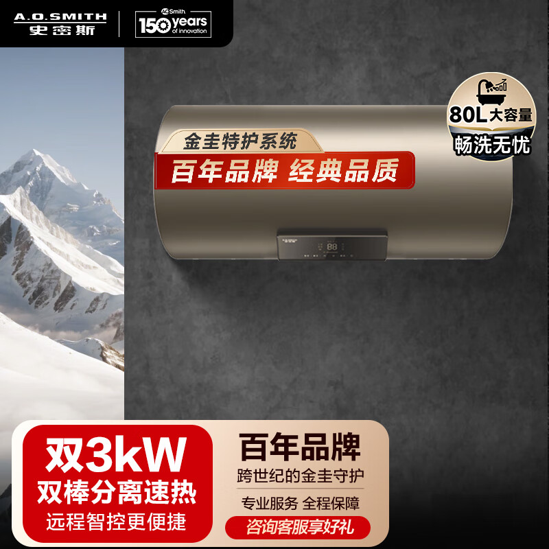 史密斯(A.O.SMITH)80升电热水器 金圭内胆 晶彩设计 手机智能操控 远程预约 双棒双3kW速热E80VDP价格:3598.00元!