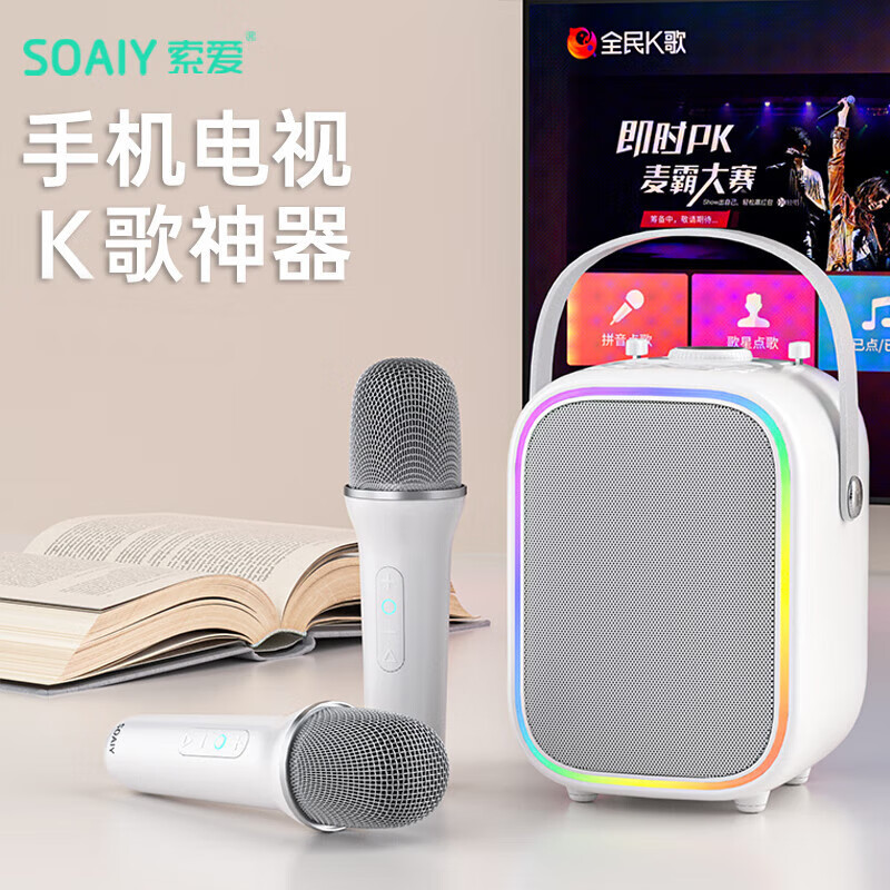 索爱(soaiy)话筒音响一体麦克风家用K歌唱歌直播专用儿童无线蓝牙家庭KTV 标准版苹果白【双话筒】价格:289.00元!