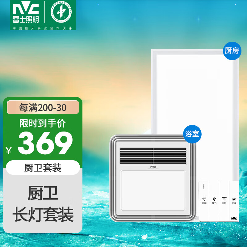 雷士(NVC)风暖浴霸LED照明换气吹风多功能卫生间暖风机兼容安装长灯套餐价格:399.00元!