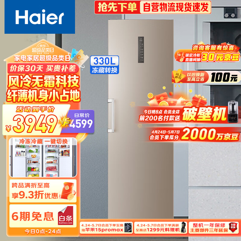 海尔(Haier)330升全冷冻小冰箱风冷无霜大容量家用冷藏冷冻立式冰柜海鲜速冻囤货BD-330WEPTU1以旧换新价格:4149.00元!