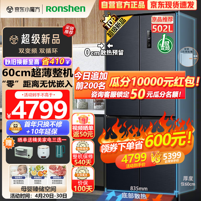 容声(Ronshen)60厘米平嵌502升十字对开四开门冰箱家用零嵌入式一级能效变频底部散热超薄大容量BCD-502WD1FPQ价格:5399.00元!