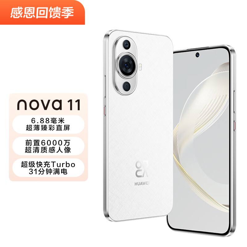 HUAWEI nova 11 前置6000万超广角人像 6.88毫米超薄臻彩直屏 256GB 雪域白 华为鸿蒙智能手机价格:2699.00元!