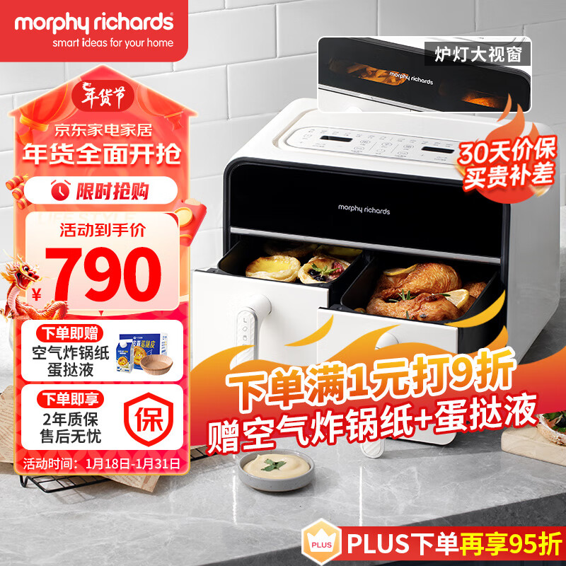 摩飞电器(Morphyrichards)空气炸锅 家用8L大容量可视双炸篮多功能空气炸烤箱 炸薯条鸡翅机MR8100富士白价格:877.00元!