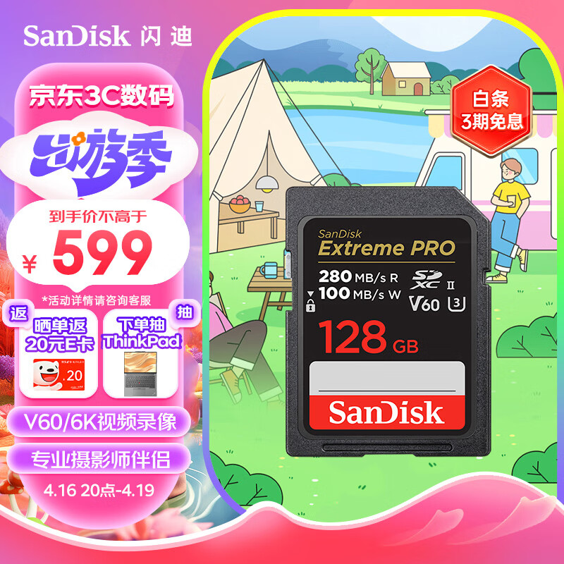 闪迪(SanDisk)128GB V60 SD存储卡U3 C10 6K高速相机内存卡 读速280MB/s 写速100MB/s 高清拍摄 畅快连拍价格:599.00元!