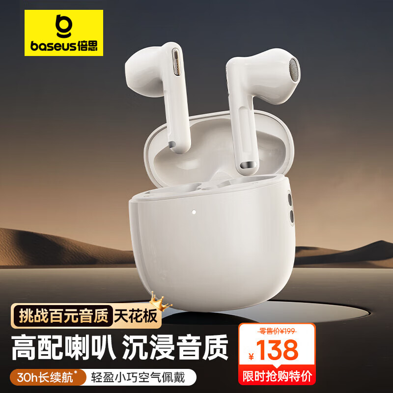 倍思 WX5 真无线蓝牙耳机 半入耳舒适佩戴 通话降噪调节音乐音量 蓝牙5.3适用苹果小米华为OPPO 白色价格:158.00元!