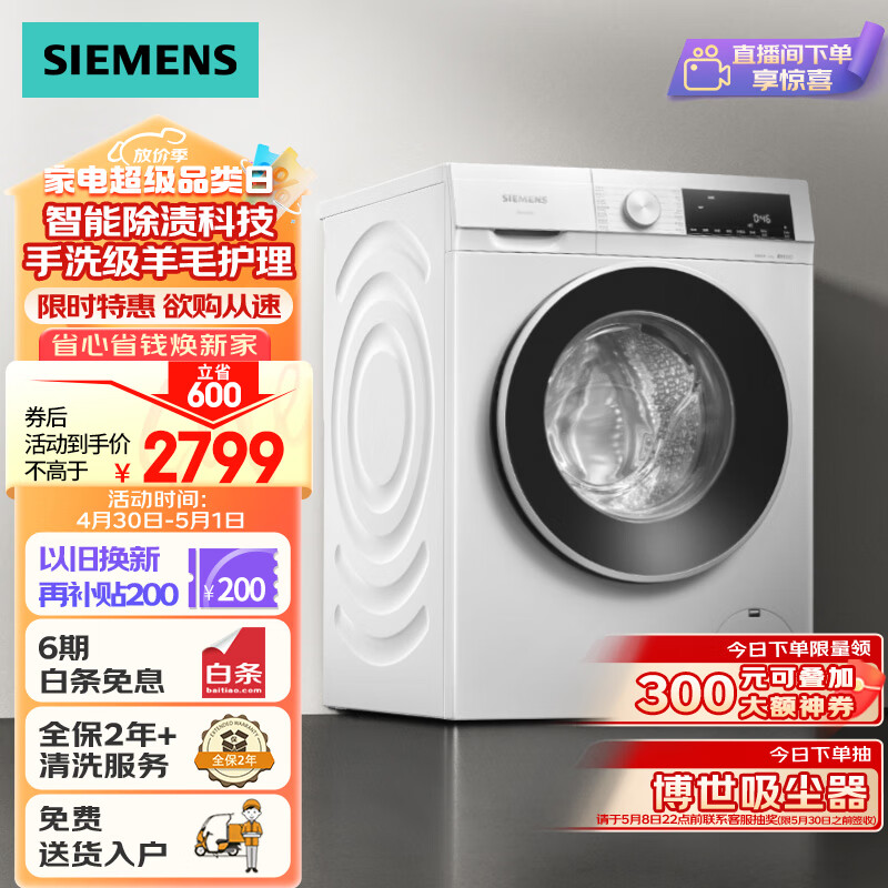 西门子(SIEMENS)iQ300 10公斤滚筒洗衣机全自动 智能除渍 除螨 防过敏 高温净筒 15分钟便捷洗护 100AW价格:3399.00元!