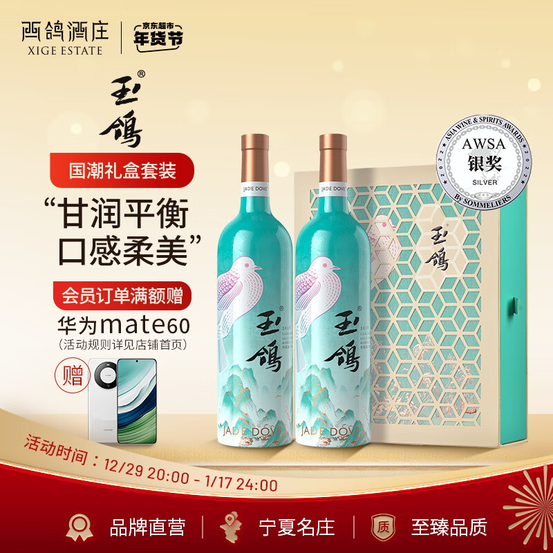 西鸽酒庄玉鸽国彩蓝国产干红葡萄酒750ml*2瓶礼盒 宁夏贺兰山红酒春节送礼价格:423.00元!