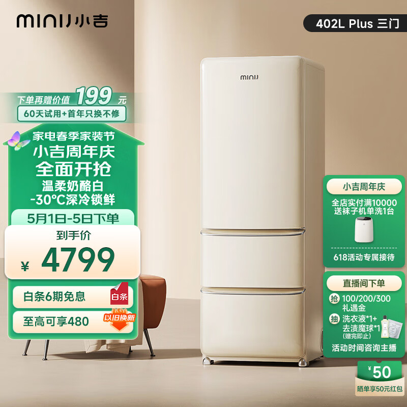 小吉402LPlus客厅冰箱双变频风冷无霜一级能效超薄嵌入式三门冰箱丨干湿分储变温低噪BCD-JY402Plus价格:4919.00元!