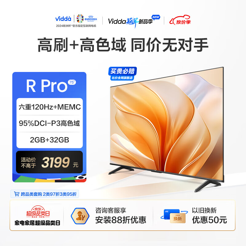 Vidda R75 Pro 海信 75英寸 120Hz高刷 2+32G 超薄屏 智慧屏 游戏液晶巨幕电视以旧换新75V1K-R价格:3199.00元!