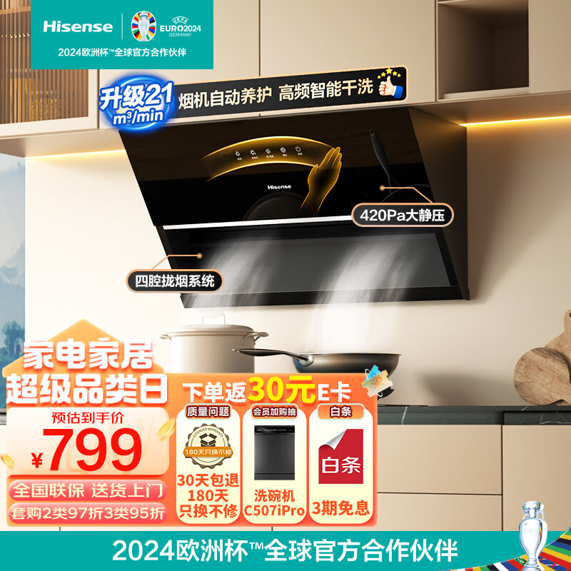 海信(Hisense)家用抽油烟机 侧吸式吸油烟机 21立方大吸力 四腔拢烟 自动清洗 脱排油烟机以旧换新DJ906H价格:1079.00元!
