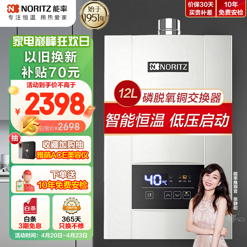 能率(NORITZ)燃气热水器 12升 CPU智能控制系统 智能精控恒温 GQ-12E3FEX(天然气)(JSQ24-E3)价格:2398.00元!