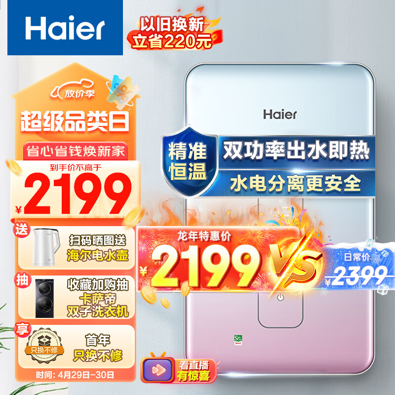 海尔(Haier)即热式电热水器电即热AI智能无感温差赠增压花洒家用 DSH--85AJ1新U1价格:2399.00元!