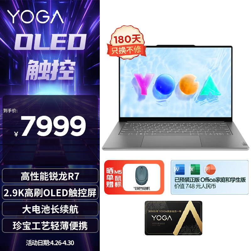 联想笔记本电脑YOGA Air14s轻盈本 高性能锐龙R7 14.5英寸轻薄本 16G 1T 2.9K OLED高刷屏银商务设计师价格:7999.00元!
