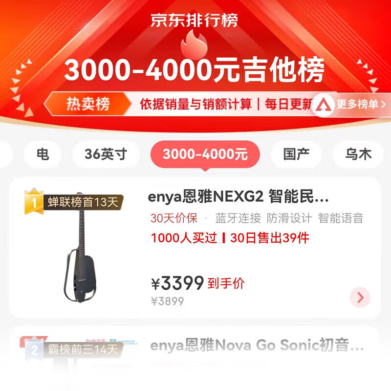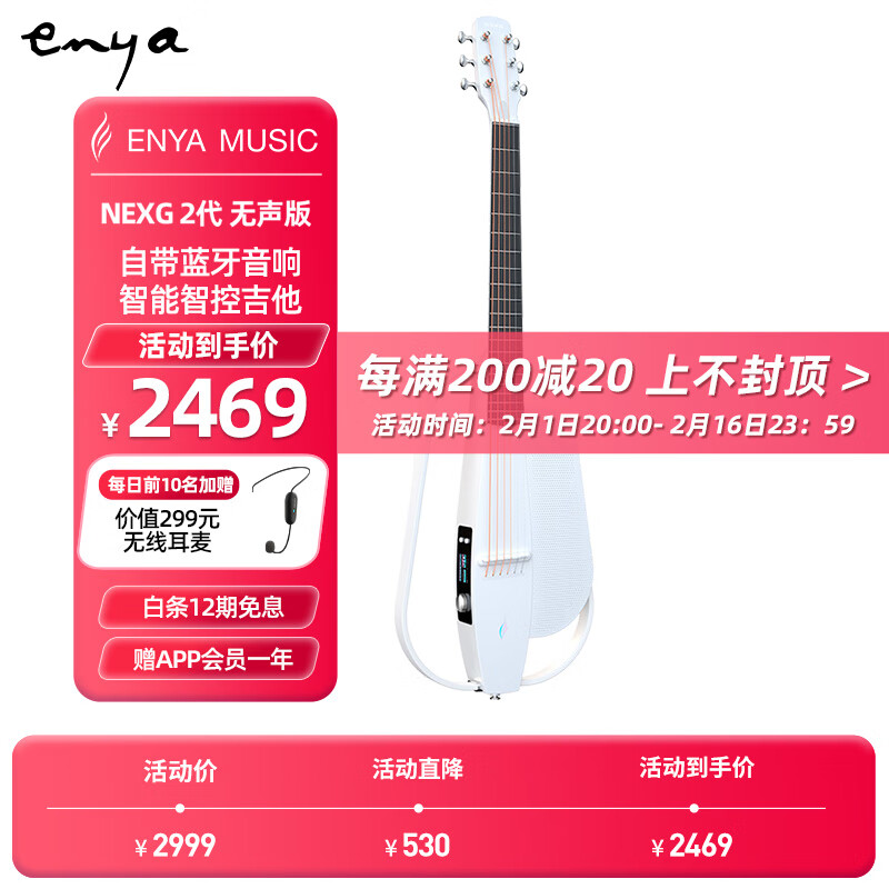 enya恩雅智能吉他 静音初学者NEXG2旅行自动挡吉他 38英寸白色价格:2999.00元!