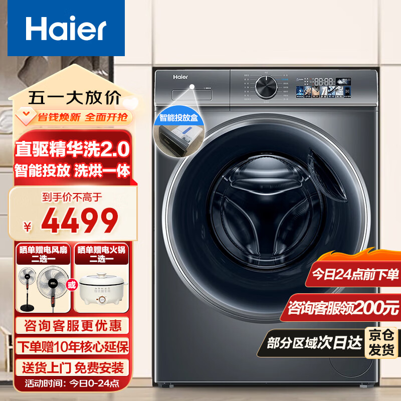 海尔(Haier)【精华洗2.0】10KG直驱变频滚筒洗衣机全自动一级能效智能投放除菌空气洗烘一体机XQG100-HBD1266价格:4499.00元!
