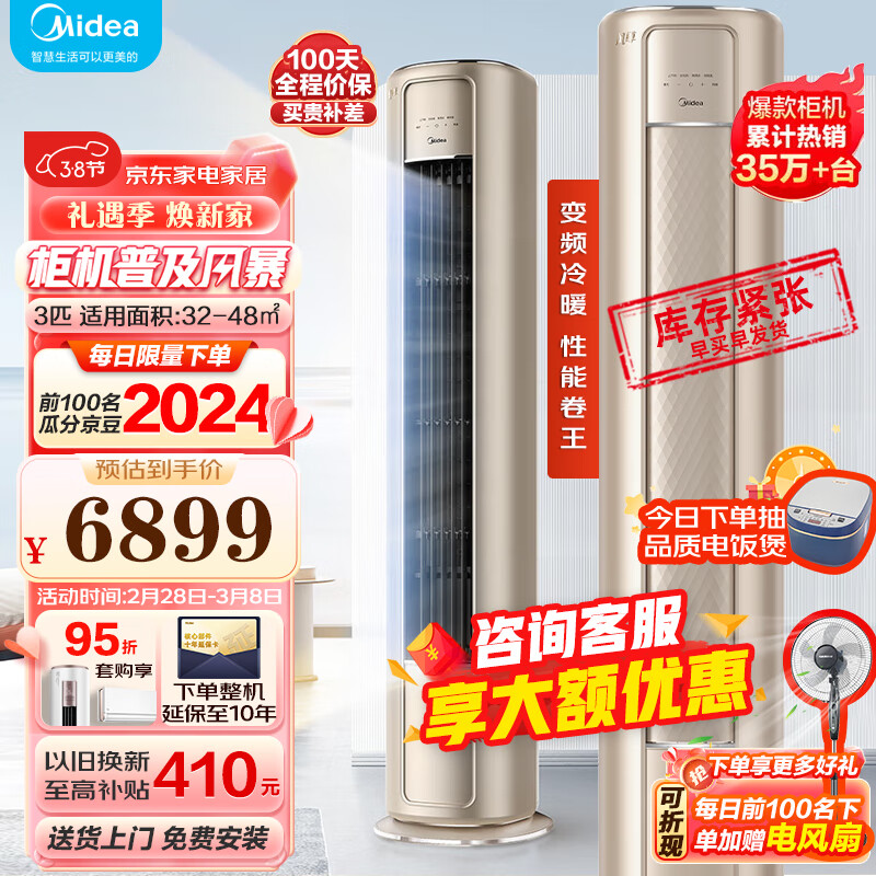 美的(Midea)风尊3匹柜机 新一级能效变频冷暖 客厅空调超大出风口 智能除菌 家用空调柜机 KFR-72LW/N8MZB1价格:6899.00元!