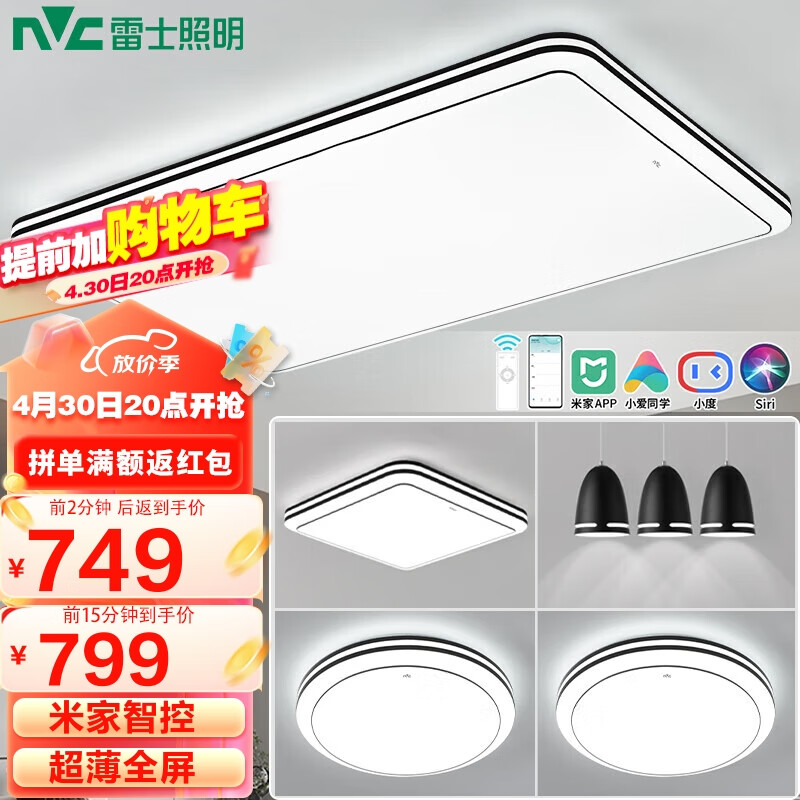 雷士(NVC)吸顶灯米家智能客厅灯北欧奶油风卧室餐厅led照明套餐黑色简影A价格:1349.00元!