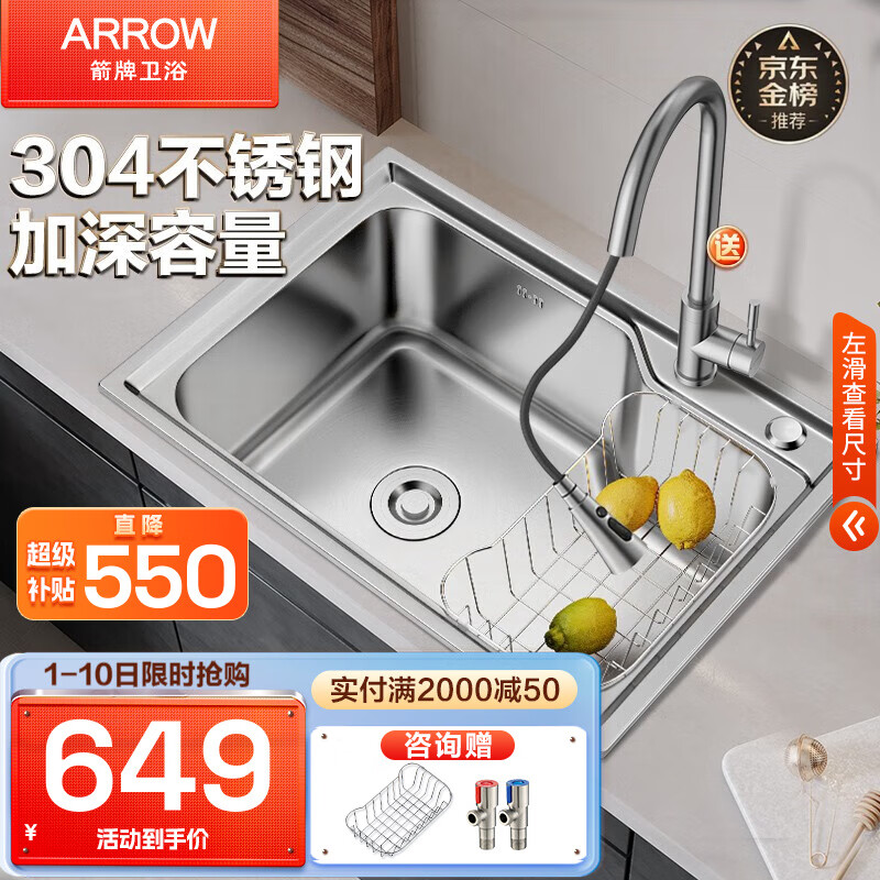 箭牌(ARROW)304不锈钢厨房水槽龙头套装小户型洗菜盆单槽支持台上台下槽安装 C2款 68*44cm+冷热抽拉龙头价格:649.00元!