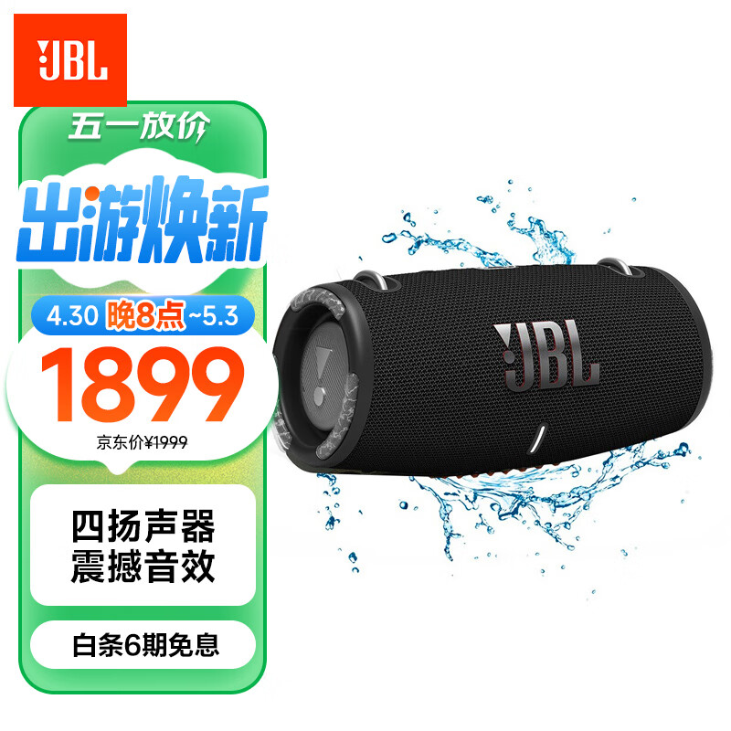 JBL XTREME3 音乐战鼓三代 便携蓝牙音箱 户外音箱 电脑音响 四扬声器系统 防尘防水 礼物音响 黑色价格:1899.00元!
