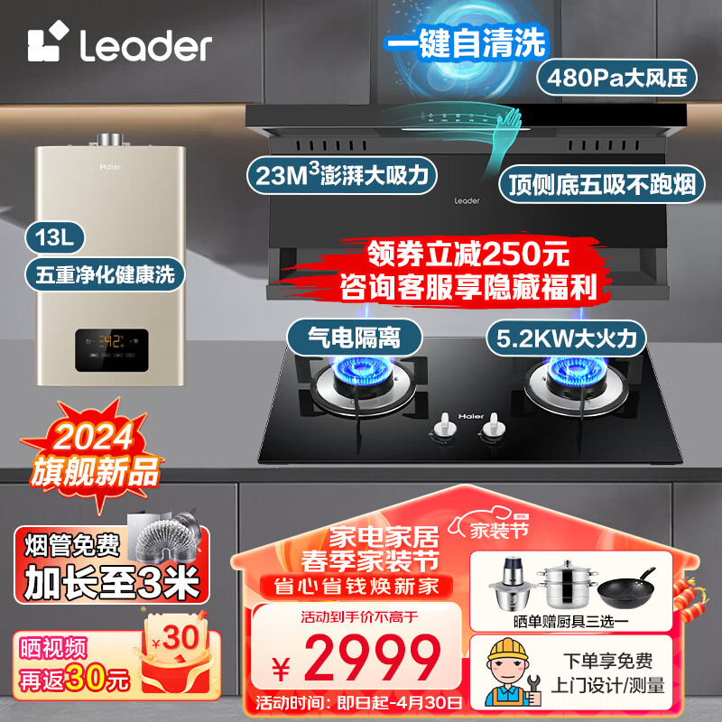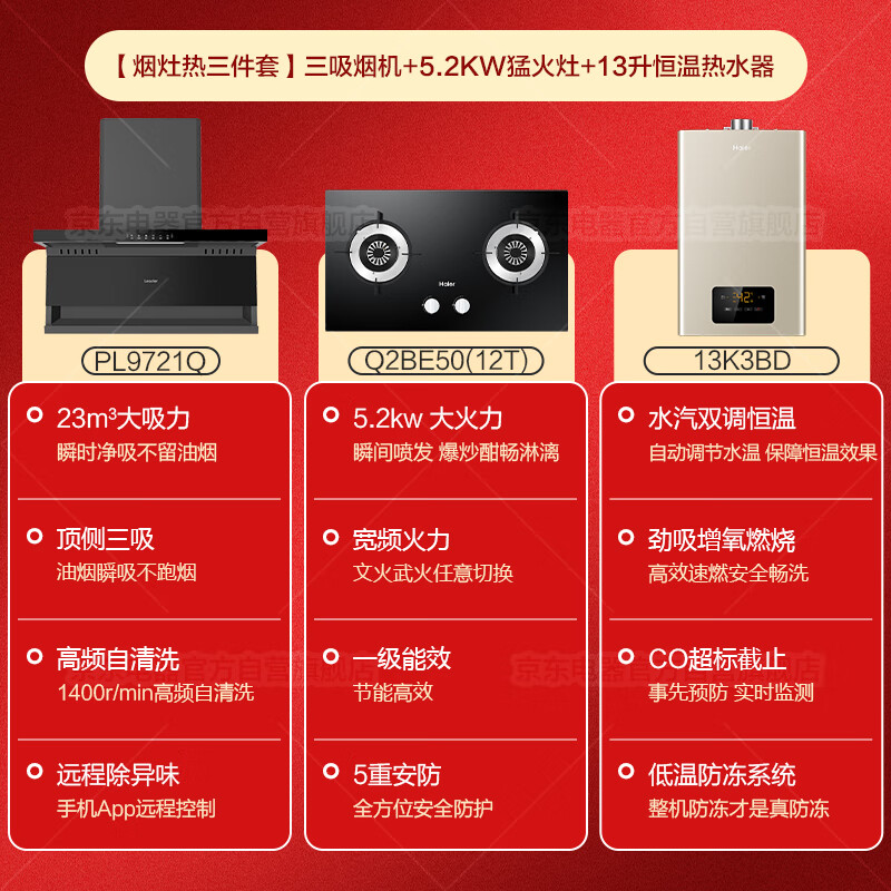 海尔(Haier)智家出品抽油烟机燃气灶套装23m3挥手智控PL9721Q+5.2KW灶Q2BE50+13升热水器13K3BD厨房三件套价格:3249.00元!