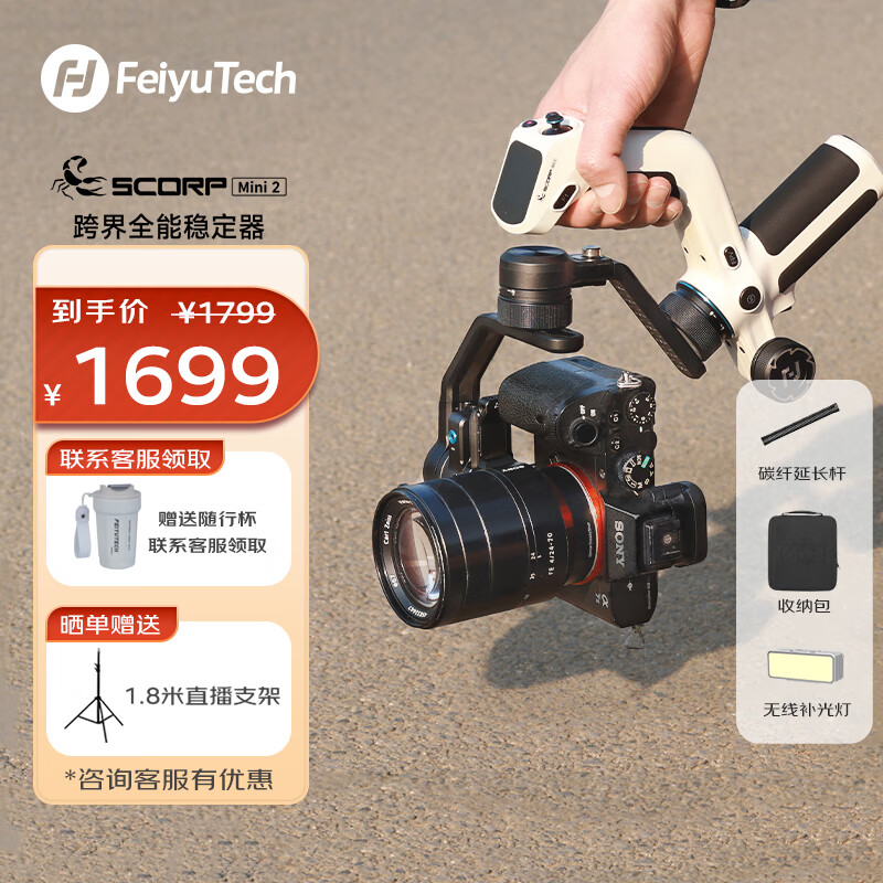 FeiyuTech 飞宇蝎子Mini 2三轴智能防抖手机稳定器 专业手持云台微单稳定器+收纳包+延长杆+补光灯价格:1699.00元!