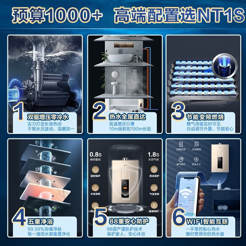 美的(Midea)16升家用双增压零冷水燃气热水器天然气 健康净浴变频省气恒温 智慧家电JSQ30-NT1S价格:1599.00元!