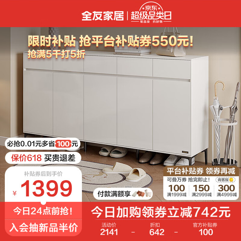 全友家居 简约五门鞋柜大容量多区储物可调节层板玄关柜置物柜126106价格:2141.43元!