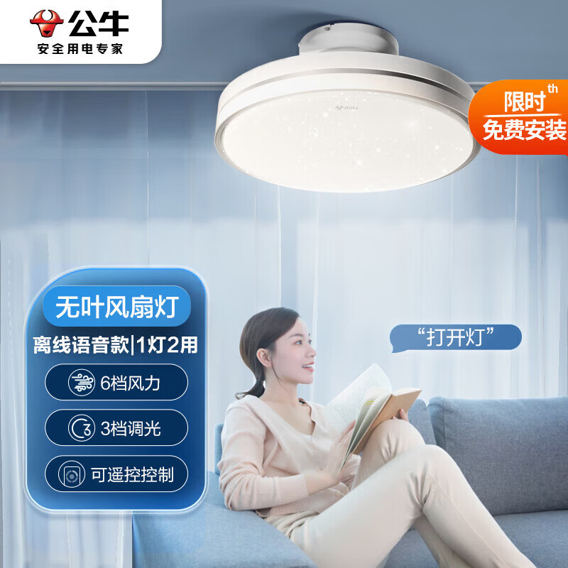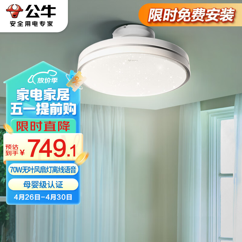 公牛(BULL)无叶风扇灯GF19BT离线语音款隐形吊扇灯宝宝风带遥控器星空灯罩价格:749.10元!