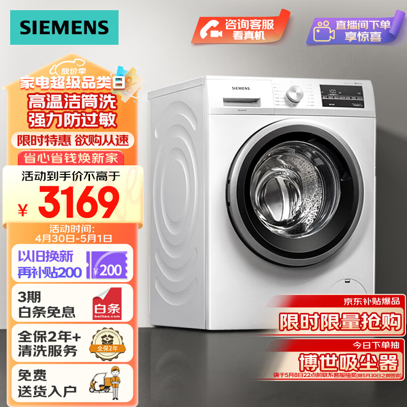 西门子(SIEMENS)10公斤滚筒洗衣机全自动 BLDC变频电机 15分钟快洗 混合洗 防过敏 XQG100-WM12P2602W价格:3169.00元!