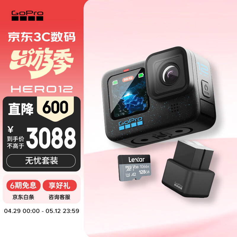 GoPro HERO12 Black防抖运动相机 增强续航 防水相机 vlog潜水滑雪摄影摄像【单机+增强双充+128G】价格:3088.00元!