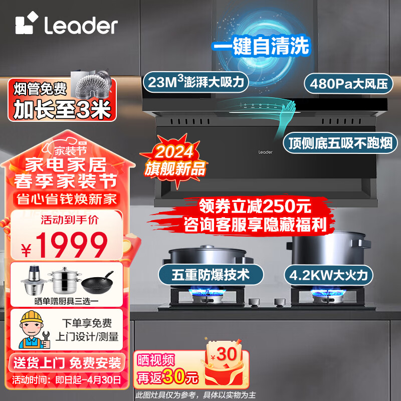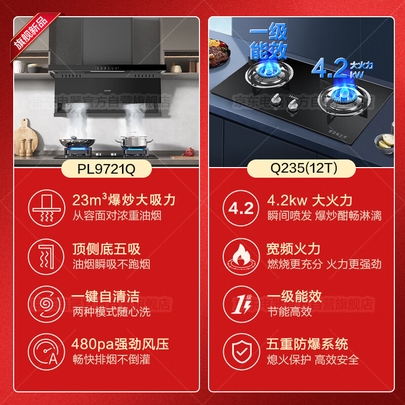 海尔(Haier)智家出品油烟机燃气灶套装 23m3顶侧双吸挥手智控吸脱排油烟机PL9721Q+4.2KW天然气Q235灶具价格:2249.00元!