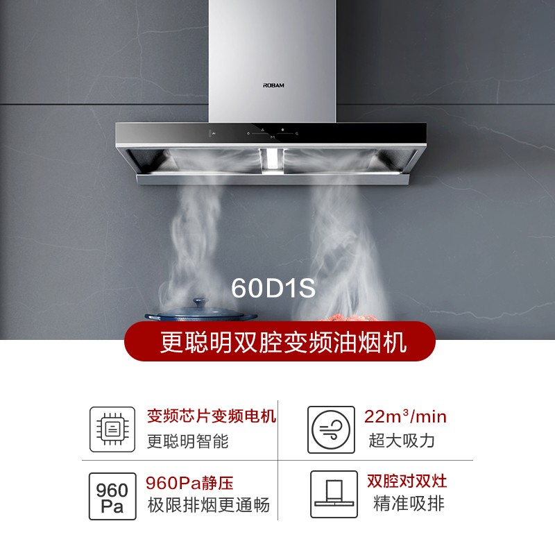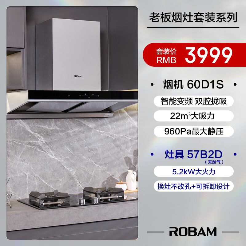 老板(Robam)领航家D1S抽油烟机欧式顶吸双腔变频22m3/min家用套装吸油烟机燃气灶60D1S套装天然气价格:3999.00元!
