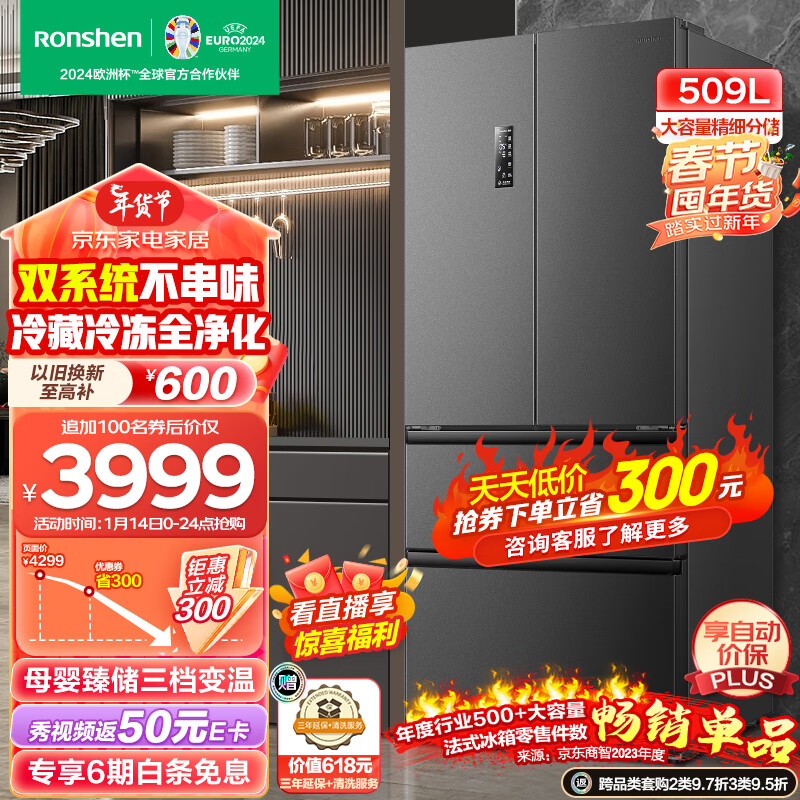容声(Ronshen)离子净味509升变频一级能效法式多门四开门嵌入式冰箱灰色家用无霜除菌BCD-509WD18MP双循环大容量价格:4299.00元!