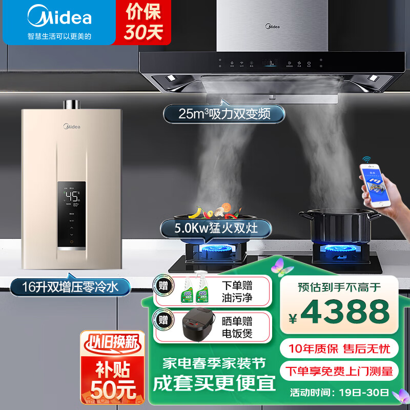 美的(Midea)欧式顶吸油烟机家用25立方大吸力双变频950Pa大静压吸油烟机 16升零冷水TV703烟灶热三件套 [家电]价格:4388.00元!