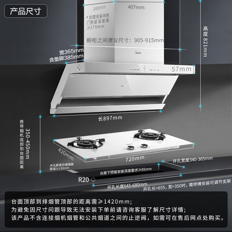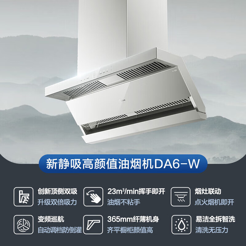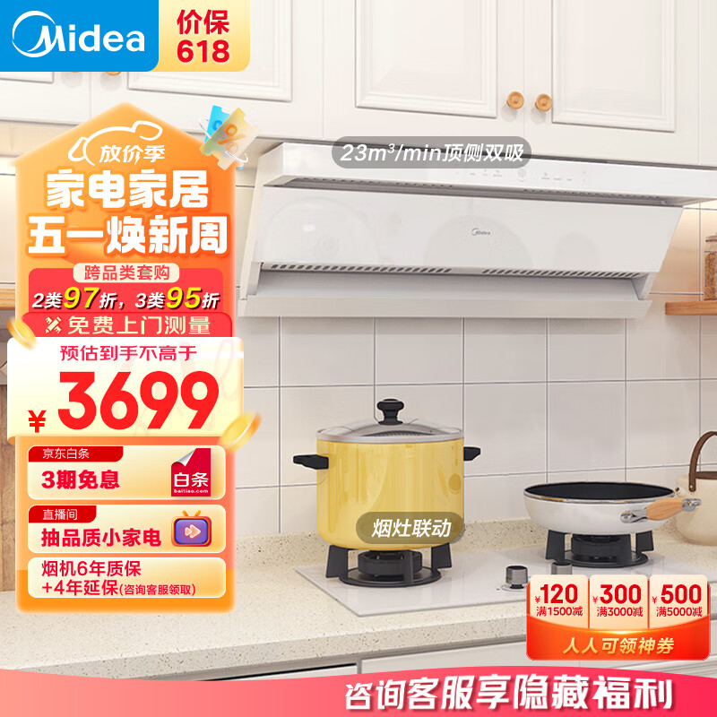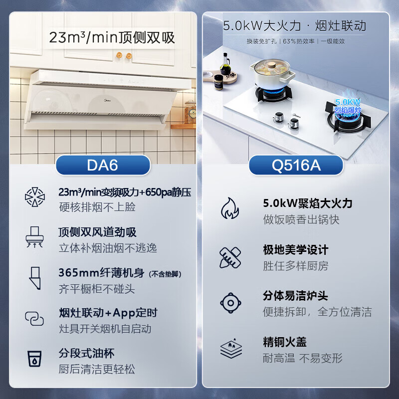 美的(Midea)抽油烟机燃气灶具 家用顶侧双吸云朵23风量大吸力烟灶联动变频排烟机烟灶套装DA6-W+516A天然气价格:3699.00元!