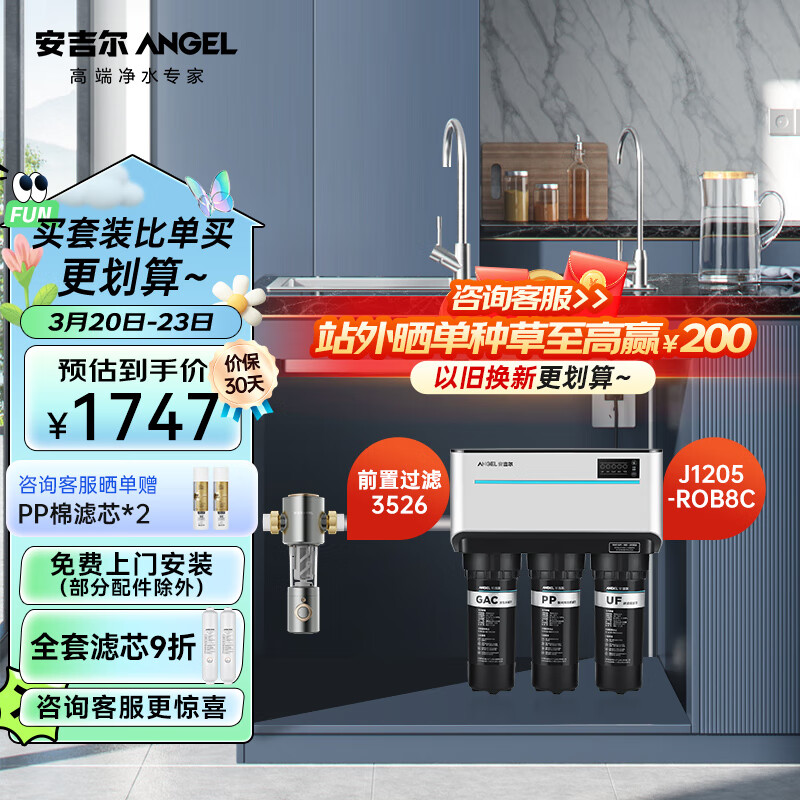 安吉尔净水器家用过滤器套装【J1205-ROB8C+前置过滤器3526】厨下式反渗透纯水机双出水机价格:1747.00元!