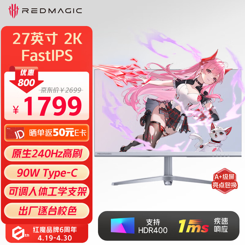 努比亚(nubia)红魔电竞显示器2K银翼版高清 27英寸 FastIPS 240Hz 1ms GTG响应 90W TypeC反向充电 游戏家用办公价格:2699.00元!