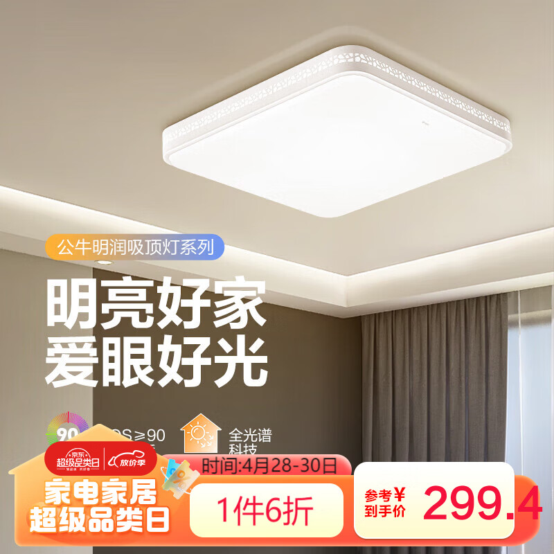 公牛(BULL)吸顶灯全光谱MX-B055D-CS明润卧室灯现代简约方形三段调光55W价格:499.00元!