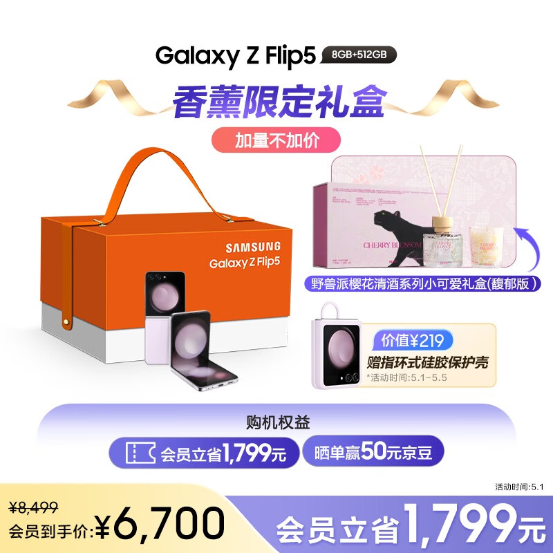 三星 SAMSUNG Galaxy Z Flip5 5G折叠手机 香薰限定礼盒 8GB+512GB 冰玫紫价格:6999.00元!