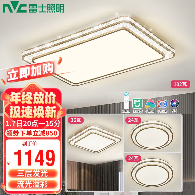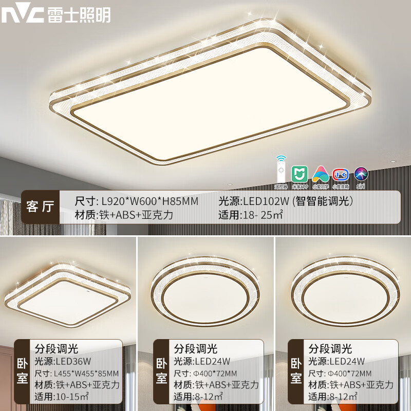 雷士照明(NVC)LED吸顶轻奢客厅书房卧室餐厅灯智控双层发光晶宏三室一厅价格:1999.00元!