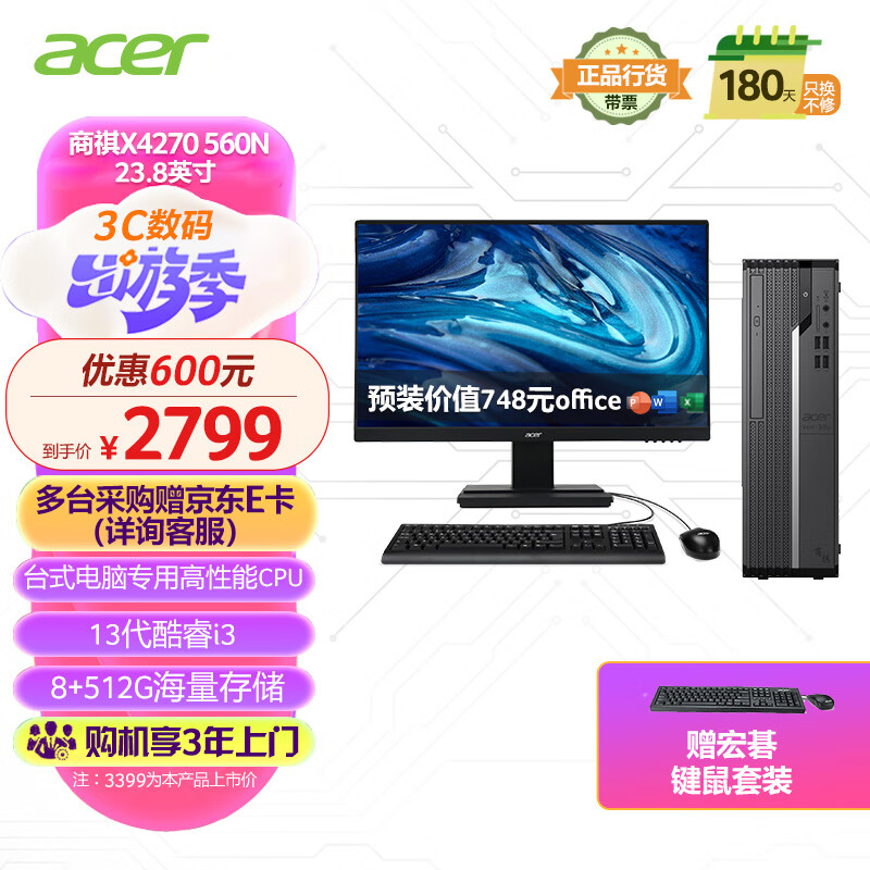 宏碁(acer)商祺X4270 560N 23款商用办公电脑台式主机 (酷睿13代i3-13100 8G 512G) 23.8英寸显示器套机价格:2799.00元!