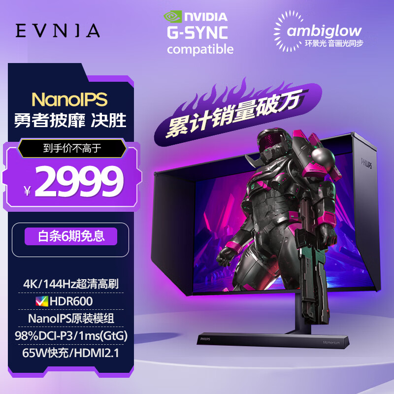 飞利浦27英寸NanoIPS出厂校准4K144Hz 1ms环景光HDR600 TypeC HDMI2.1电竞显示器DTS音效红点奖279M1RVE价格:2999.00元!