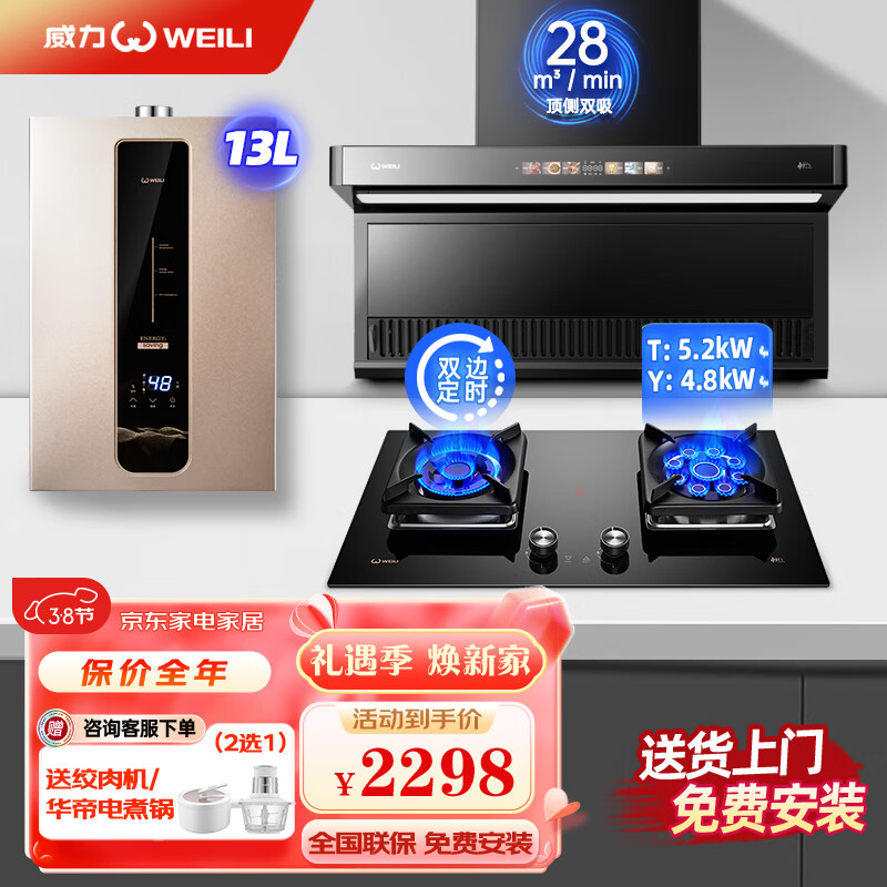 威力(WEILI)顶侧双吸抽烟机灶具热水器三件套装28m3大吸力吸油机烟灶热套装WLQ07+WL311DJ+WL13T(天然气)价格:2298.00元!